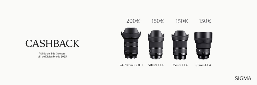 Obtén hasta 200 € de cashback en la compra de una selección de objetivos SIGMA Art para cámaras con sensor de formato completo. La oferta incluye el versátil Sigma 24-70mm F2.8 y las tres ópticas prime de 35mm, 50mm y 85mm. Válido del 1 octubre hasta 1 diciembre 2025.